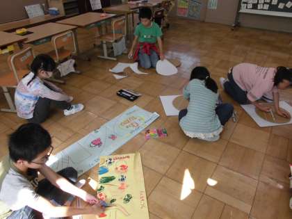 ずいき祭りを見学した時に見つけたお祭り飾りを写真で振り返り、「のぼり」「提灯」「看板」を、3くみまつりでもつくろう!ということになり、今週は巨大提灯をつくりました。長さを測って切ったり、上部になるように段ボールで補強したり、自分たちの好きなものをたくさん描き込んだりして、お祭りを盛り上げる素敵な提灯が完成しました。