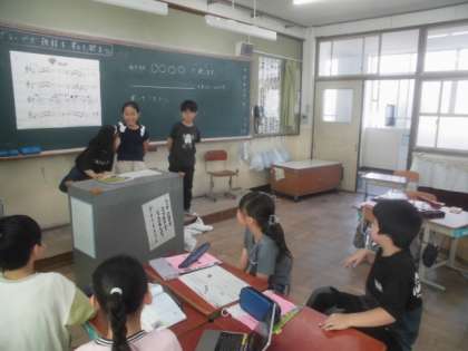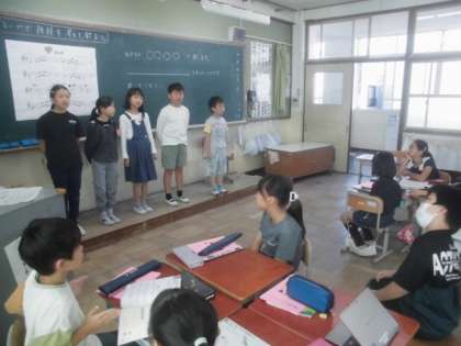音楽科で、グループに分かれて「とんび」を歌いました。グループで相談し、強弱を工夫しました。とんびと人のかけ合いを、音楽の要素である「よびかけとこたえ」で表現できることを学ぶことができました。
