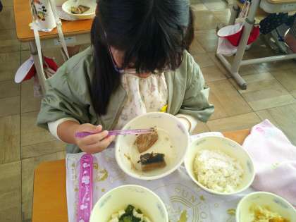 また、今日は和献立の日で、和食を味わって食べる日でした。「初めてなめこを食べた!」「とりめしの具おいしい!」と友だちと話しながら、楽しく給食時間を過ごしました。