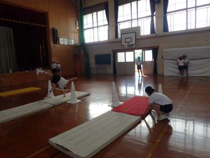 体育科では、マット運動の学習をしています。