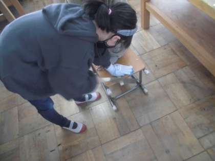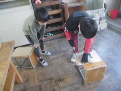 のこぎりを使って、板や角材を切っています。力の入れ具合や刃の引き方、刃の角度をどうすれば切りやすいのかなど、実際に経験しないと分からないことを、楽しく経験できています。イメージをふくらませながら、友達と協力、相談しながら進めています。