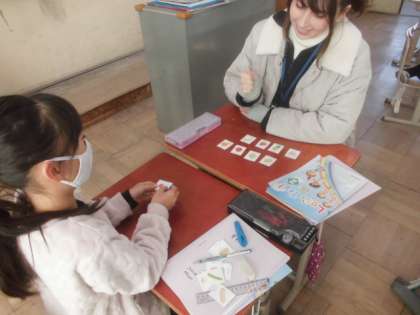 友達と、果物・野菜カードのやり取りをして、オリジナルパフェやピザを作る活動をしました。声に出し、友達とかかわることで身についているようです。