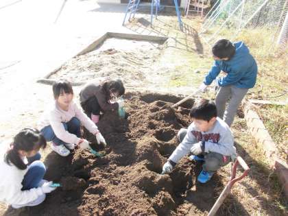 サツマイモの収穫が終わり、次は冬に植える野菜のために、畑の手入れをしました。時間が経ち、かたまってしまった土を耕し、肥料をまきました。耕す中で自然と山を作り始めたり、トンネルを作ったりと、造形遊びも一緒に楽しみました。