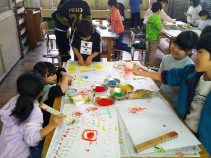 いろいろな材料のかたちをうつしたものを見て、想像したものをあらわしました。