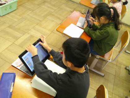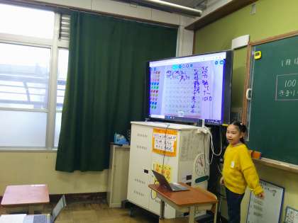 タブレットの表に、気付いたことを書きこみ、発表のときは、自分の書きこんだものをクラスに見せながら、考えを伝えました。