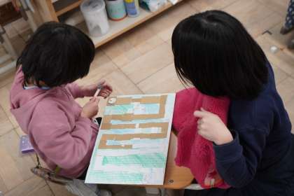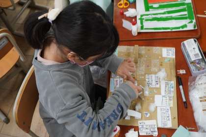 クリップと磁石を使って、楽しく遊べる作品をつくっています。「正しい道を進んでいかなければならない」ルールや「ミッションをクリアしていかなければならない」といったゴールに向かって進んでいくものもあれば、ゴールを設定しないでいろんなところを楽しく回ることができるといったものもあり、それぞれが工夫をしてつくっています。