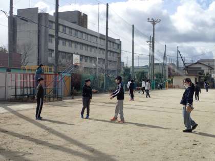 今日は5年生の野球の日でした。この日を楽しみにしていた5年生は休み時間になると一目散に野球セットを持って運動場へいきました。