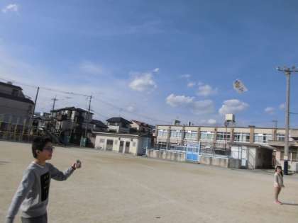 いろいろ凧作りの最終回として、ぐにゃぐにゃ凧をつくりました。「今までで一番高い!」「歩いてても上がる!」と思い思いの感想を出し合いました。とても楽しく活動することができました。