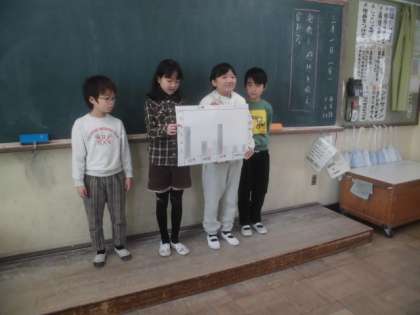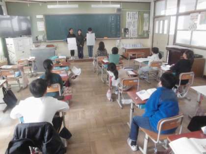 アンケートをとってまとめたことを、資料を使って分かりやすく発表する活動をしました。声の大きさや強弱、目線など、話し方の工夫をして発表をしました。