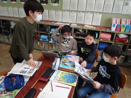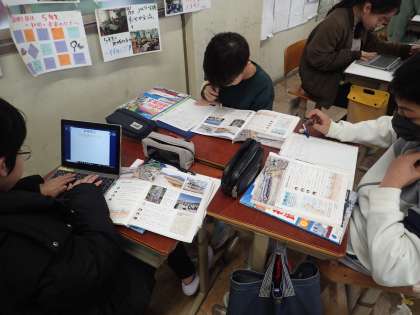今日は、風水害・地震・津波・火山・大雪の気候や地形の関わりや人々の取り組みについて教科書や資料集を見ながらグループでまとめました。