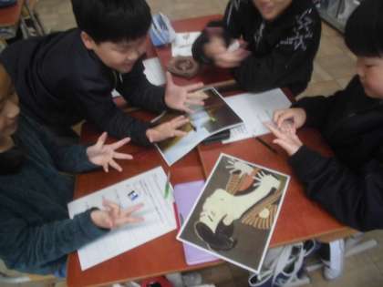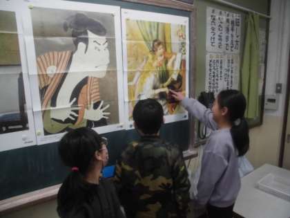 図画工作科で、「色や形、ポーズから、絵画がどんな場面なのか想像しよう。」というめあてで取り組みました。「青色だから悲しい気持ちなんだと思う。」「この男の子とこの男の子は目がちがうから、ちがう気持ち。」「この手と眉毛は、怒っているのかも。」いろいろな意見で話し合っていました。