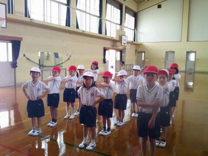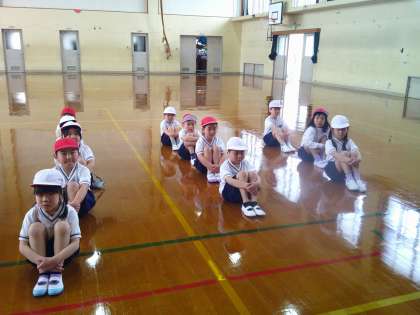 みんなでまっすぐに並ぶ練習をしました。「前にならえ」をしました。また,体育座りも練習しました。