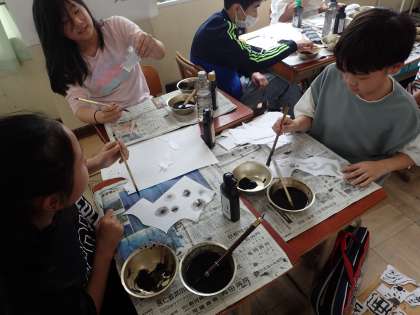 いつも習字の学習で使っている筆に墨と水をつけ、和紙にぽたっと落としたり、にじませた理すると色々な形が生まれました。