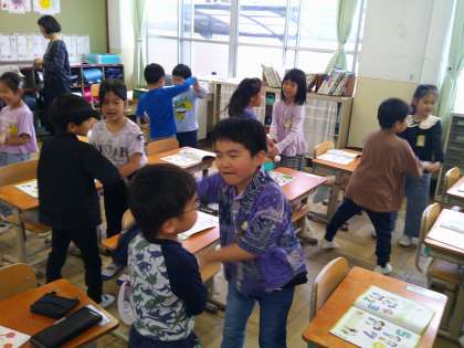 『きょくをきいて、みんなであそびながらうたおう。』をめあてに、学習を進めました。初めて聴く曲でも自然と体が動く子どもたち。ノリノリで踊っていました。