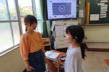 How are you? I'm good.や I'm sleepy.など、気持ちの表現を学習し、友だち同士で尋ね合いました。
