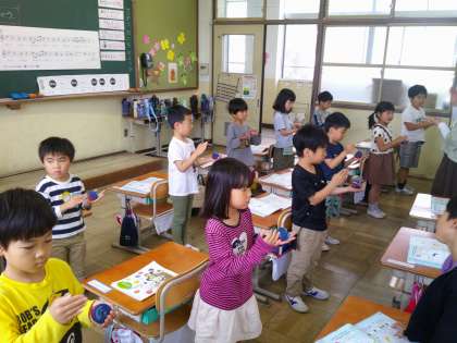 今日の音楽の学習では、「しろくまのジェンカ」の曲に合わせて、リズム打ちをしたり、体を動かしたりしました。