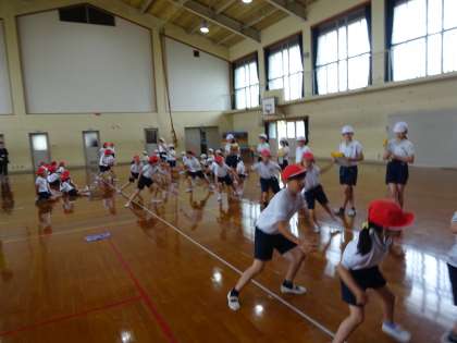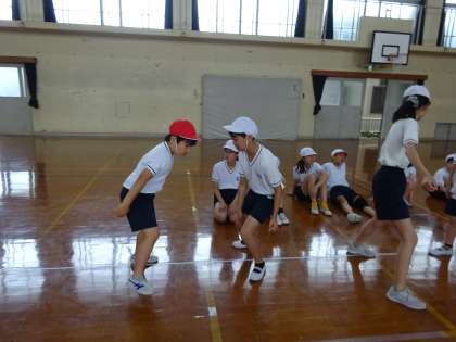 今日は「反復横跳び」に挑戦しました。初めて反復横跳びをする2年生に向けて、フレンドリーグループの6年生が跳び方を教えてくれました。