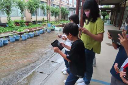 この日は大雨だったので、屋根のあるところからの観察になり、それぞれタブレットを持って地面の様子を写真や動画におさめました。教室では、写真や動画を見せながら発表することで、「あ〜、見た見た!」「私もそこ見たよ!」など、具体的に場所を見ながら交流することができましたね。