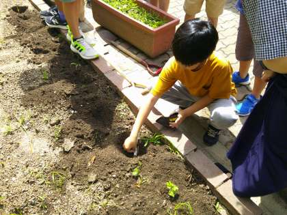 理科の学習で育てているツルレイシの葉が子葉のほかに3〜4枚になったものがあるので、学校の花壇に植えかえました。