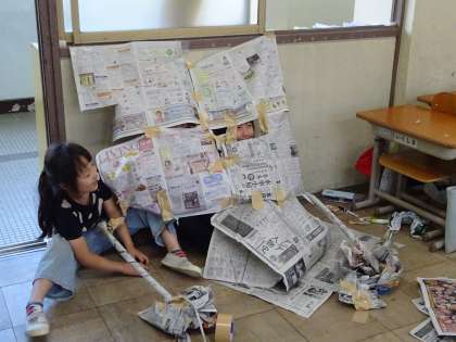 2年生は図画工作科「しんぶんしとなかよし」の学習で、新聞紙を使って造形遊びをしました。新聞紙の形を変えたり、組み合わせたりして、思い思いの工夫をしながら楽しみました。