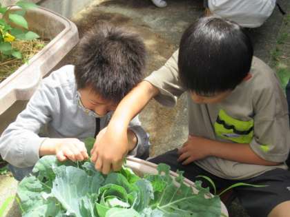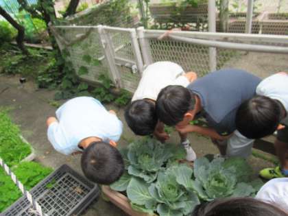 この日は、学校にあるキャベツの葉についているたまごを探しました。見つけたたまごは葉をつけたまま持ち帰り、それぞれの入れ物でこれから育ちを観察します。たまごを落とさないように慎重に動いていた3年生たちでした♪