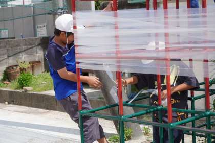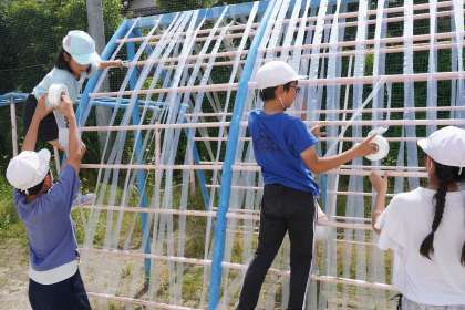 いろいろなものをつつんだら、どんな感じ方ができるのかを学習しました。今回は遊具をつつんでみました。もともとの形とはちがったものに見えたり、光で美しく見えたり、近くから見たり遠くから見たりすると違った見え方ができたり、様々なことを感じることができました。大変な片付けも、みんなで協力してテープ一つ残さずきれいに後片付けをすることができました。