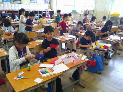 生き物や町並み、電車などの乗り物、いろいろなものを思いついていました。友だちとの作品鑑賞会も楽しんでいました。
