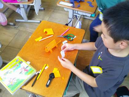 折ると紙がたつ仕組みを使って、紙を切ったり、パスやクーピーで色をつけ足したりしました。