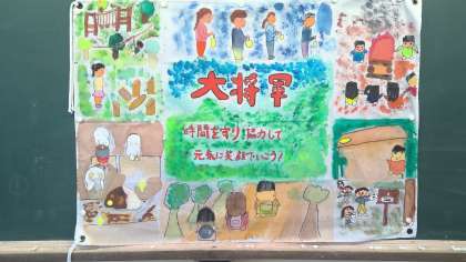 みんなで取り組んできた、花背山の家の学級旗がついに完成しました。さまざまな活動をイメージして描いていきました。旗係として頑張った子どもたちは出来上がった旗を見てとても満足した顔をしていました。この旗が、山の家の玄関前で風にゆられているのを見るのがとても楽しみです。