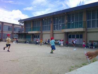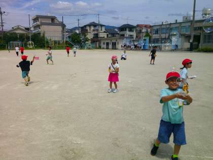 生活科「なつとともだち」の学習で水鉄砲遊びをしたり、運動場に絵や字を書いたりして遊びました。他にもシャボン玉をいっぱい作って遊びました。いい天気だったので、たくさん遊べて、みんな喜んでいました。