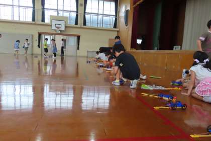 前回の風の強さと車が動いた距離の結果から、「ゴムを長くのばすと車は遠くまで進むのではないか。」という予想をしている子どもたちが多かったです。