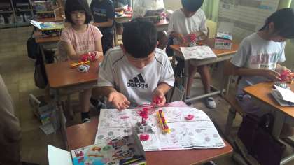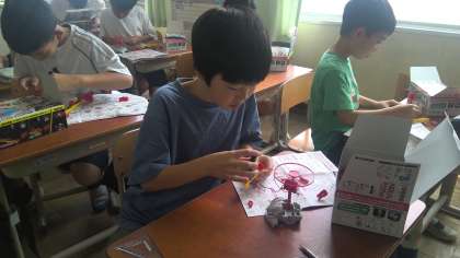 テストを頑張った4年生は、電気のはたらきの学習で使った実験セットで、プロペラとばしをしました。