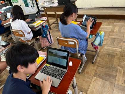 カントリーエレベータや広大な水田、広域農道の規模に、子どもたちは驚きの声をあげていました。実際に庄内平野に行くことは難しいですが、GIGA端末を活用することで教科書で学んだ内容をより深く理解することができます。まるでバーチャル社会見学のようでした。
