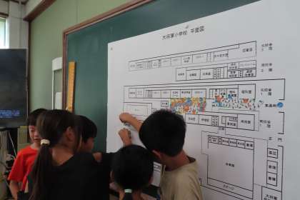 タブレットを使ってどこで見つけたのかを記録し、校内地図に虫シールを貼ってまとめました。どこにどんな虫がいたのかわかりやすくなりましたね。