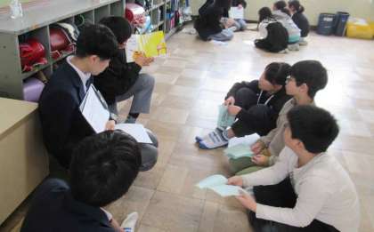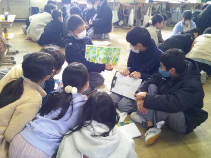 今日の5時間目に北野中学校の2年生に来たもらい、英語の本の読み聞かせをしてもらいました。