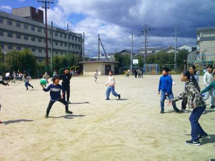 休み時間にはみんなでドッジボールをしました。6年生が楽しそうに遊んでいると2年生や4年生も入って更に盛り上がりました。