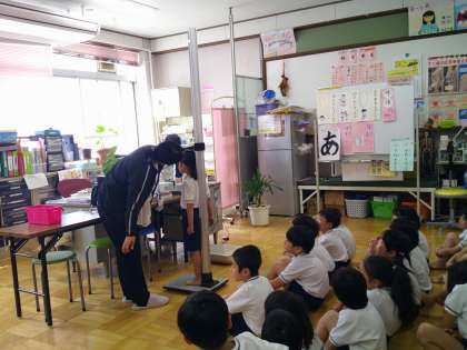 今日は、初めての身体計測でした。保健室に行く前に養護教諭の谷水先生に保健室のお話を聞きました。保健室がどんなところかしっかり教えてもらいました。