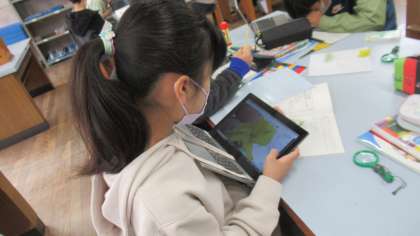 その後、「じゃあほかの花はどうなんだろう。」という問いを解き明かすために、今度は虫眼鏡をもって学校の花の観察へ。