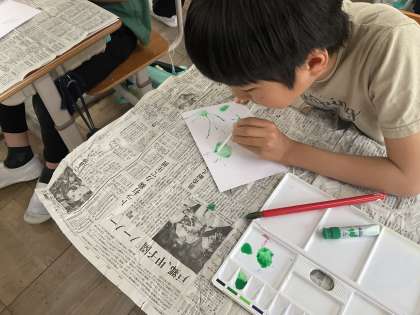 図画工作科の「絵の具+水+○○」=いいかんじの学習で、絵の具とストローを使って絵を描きました。