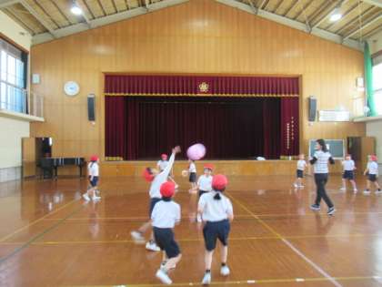 今日の体育の学習では、体ほぐしの運動をしました。グループに分かれて風船バレーをしました。風船を落とさないように、協力して楽しく活動しました。