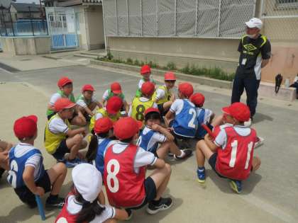 リレーについて学習しています。バトンパスの時にリードを行い、減速を防いでいます。グループで話し合いをたくさん行っています。