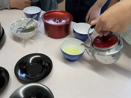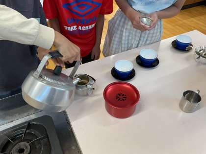 ガスこんろの使い方を知り、適切な湯の温度や茶葉を蒸らす時間など、基本的なお茶のいれ方を学びました。
