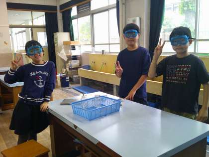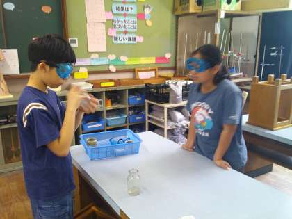 石灰水が目に入らないようにするために保護メガネをかけました。