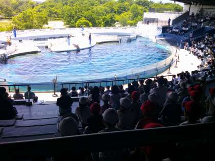 なかよしグループで見て回った後は、イルカの学校の体育の時間を見ました。イルカがいろいろな技をしているのを見て、「おー、すごい!」と驚いていました。
