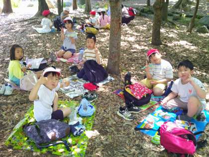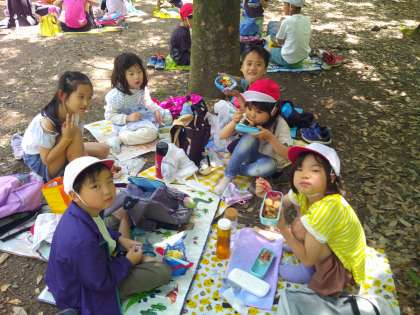 水族館から出て、梅小路公園でお弁当を食べました。たくさん歩いて見て回ったので、おなかがペコペコでした。なかよしグループで楽しく食べました。朝早くからご準備、ありがとうございました。