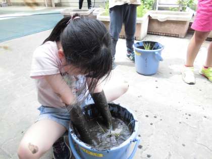 前回、土づくりをしたバケツに稲の苗を植えました。