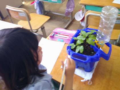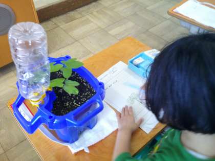 生活科の時間にアサガオの観察をしました。6この種を植えました。芽が出た数は様々ですが、みんなしっかりした芽が出てきました。毎日毎日、水やりを頑張っています。