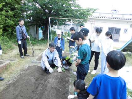 いよいよ本日の主役、サツマイモの苗の登場です。しっかり説明を聞いて、上手に植えることができました。