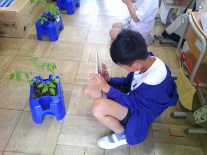 生活科の学習で、ミニトマトを育てています。茎も太くなり、どんどん伸びてきたので、倒れないように支柱を立てました。また、成長具合をタブレットで写真を撮って記録しました。花が咲きかけているところもあり、子どもたちも嬉しそうでした。