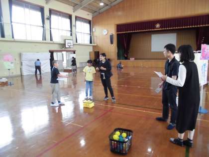 体育館に子どもたちが考えたたくさんのブースをつくり、お家の方に楽しんでいただくことができました。